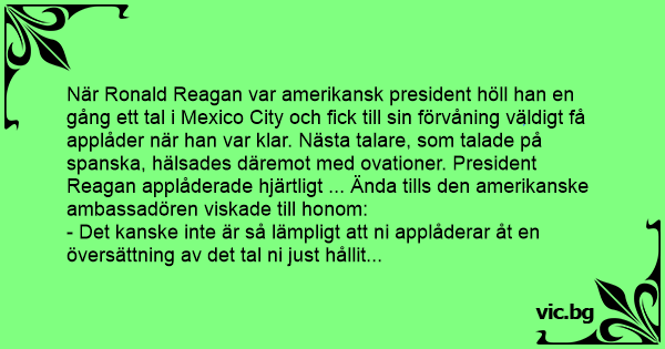 När Ronald Reagan var amerikansk president höll han en gång ett tal i Mexico City och fiск till sin förvåning väldigt få applåder när han var klar. Nästa talare, som talade på spanska, hälsades däremot med ovationer. President Reagan applåderade hjärtligt ... Ända tills den amerikanske ambassadören viskade till honom: