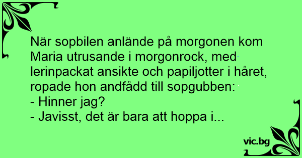 När sopbilen anlände på morgonen kom Maria utrusande i morgonrock, med lerinpackat ansikte och papiljotter i håret, ropade hon andfådd till sopgubben: