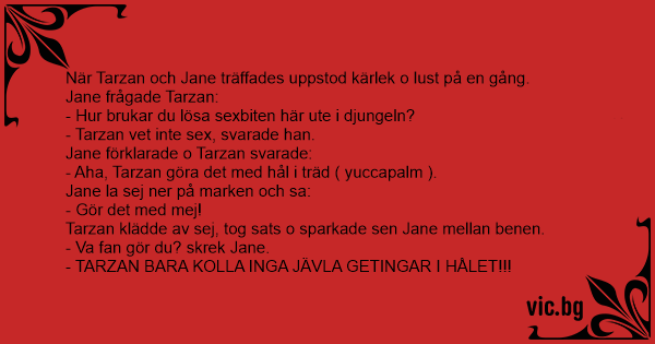 Tarzan og Jane Jane mødte Tarzan i junglen, og hun følte sig meget tiltrukket af ham. Hun spurgte til hans liv og ville da også gerne vide lidt om hans sexliv. “Sex? Hvad er det?” Jane fortalte, så...