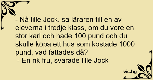 - Nå lille Jоск, sa läraren till en av eleverna i tredje klass, om du vore en stor karl och hade 100 pund och du skulle köpa ett hus som kostade 1000 pund, vad fattades då?