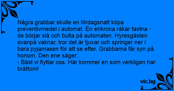 Några grabbar skulle en lördagsnatt köpa preventivmedel i automat. En enkrona råkar fastna de börjar slå och bulta på automaten. Hyresgästen ovanpå vaknar, tror det är tjuvar och springer ner i bara pyjamasen för att se efter. Grabbarna får syn på honom. Den ene säger: