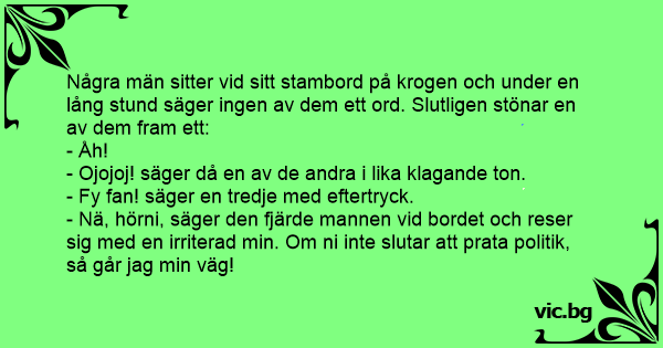 - Nä, hörni, säger den fjärde mannen vid bordet och reser sig med en irriterad min. Om ni inte slutar att prata politik, så går jag min väg!