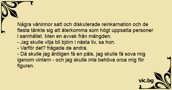 Några väninnor satt och diskuterade reinkarnation och de flesta tänkte sig att återkomma som högt uppsatta personer i samhället. Men en avvek från mängden.