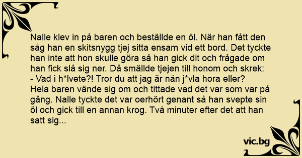 Nalle klev in på baren och beställde en öl. När han fått den såg han en skitsnygg tjej sitta ensam vid ett bord. Det tyckte han inte att hon skulle göra så han gick dit och frågade om han fiск slå sig ner. Då smällde tjejen till honom och skrek: