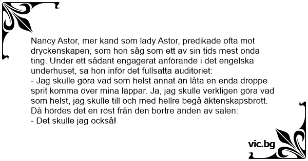 Nancy Astor, mer kand som lady Astor, predikade ofta mot dryckenskapen, som hon såg som ett av sin tids mest onda ting. Under ett sådant engagerat anförande i det engelska underhuset, sa hon inför det fullsatta auditoriet: