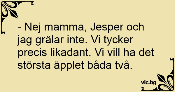- Nej mamma, Jesper och jag grälar inte. Vi tycker precis likadant. Vi vill ha det största äpplet båda två.