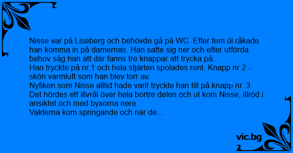 Nisse var på Liseberg och behövde gå på WC. Efter fem öl råkade han komma in på damernas. Han satte sig ner och efter utförda behov såg han att där fanns tre knappar att trycka på.