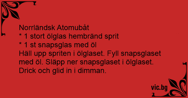 Häll upp spriten i ölglaset. Fyll snapsglaset med öl. Släpp ner snapsglaset i ölglaset. Drick och glid in i dimman.
