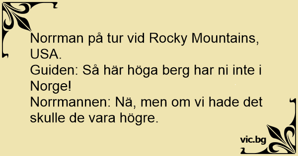 Norrman på tur vid Rocky Mountains, USA.<br />Guiden: Så här höga berg har ni inte i Norge!<br />Norrmannen: Nä, men om vi hade det skulle de vara högre.