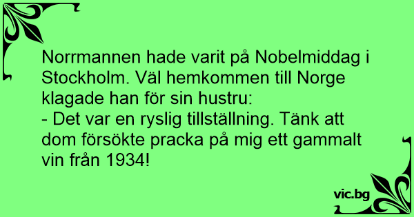 Norrmannen hade varit på Nobelmiddag i Stockholm. Väl hemkommen till Norge klagade han för sin hustru: