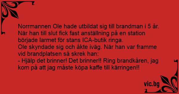 - Hjälp det brinner! Det brinner!! Ring brandkåren, jag kom på att jag måste köpa kaffe till kärringen!!