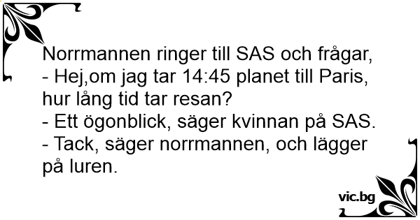 En svenske ringte flyselskapet og spurte hvor lenge flyturen mellom Stockholm og Paris varte. "Et øyeblikk bare", sa konsulenten. "Flott," sa svensken og la på.