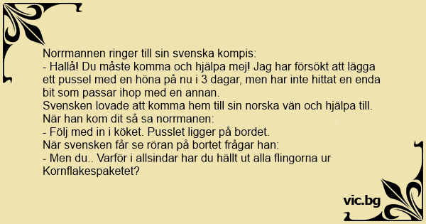 - Hallå! Du måste komma och hjälpa mej! Jag har försökt att lägga ett pussel med en höna på nu i 3 dagar, men har inte hittat en enda bit som passar ihop med en annan.