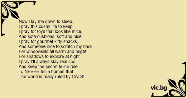 Now I lay me down to sleep, I pray this cushy life to keep. I pray for toys that look like mice, And sofa cushions, soft and nice. I pray for gourmet kitty snacks, And someone nice to scratch my back, For windowsills all warm and bright, For shadows to explore at night. I pray I’ll always stay real cool And keep the secret feline rule - To NEVER tell a human that The world is really ruled by CATS!