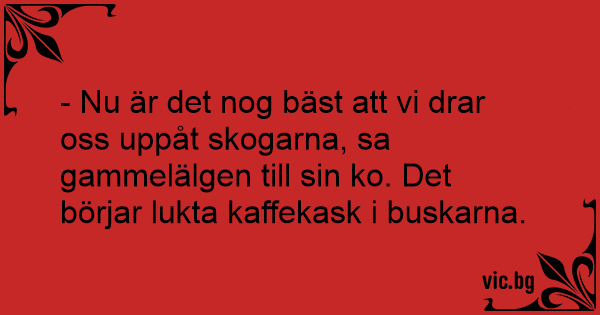 - Nu är det nog bäst att vi drar oss uppåt skogarna, sa gammelälgen till sin ko. Det börjar lukta kaffekask i buskarna.