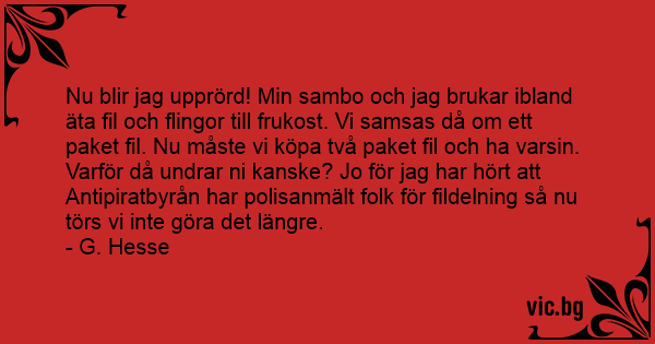 Nu blir jag upprörd! Min sамво och jag brukar ibland äta fil och flingor till frukost. Vi samsas då om ett paket fil. Nu måste vi köpa två paket fil och ha varsin.