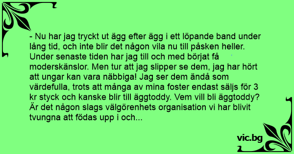 - Nu har jag tryckt ut ägg efter ägg i ett löpande band under lång tid, och inte blir det någon vila nu till påsken heller. Under senaste tiden har jag till och med börjat få moderskänslor. Men tur att jag slipper se dem, jag har hört att ungar kan vara näbbiga! Jag ser dem ändå som värdefulla, trots att många av mina foster endast säljs för 3 kr styck och kanske blir till äggtoddy. Vem vill bli äggtoddy? Är det någon slags välgörenhets organisation vi har blivit tvungna att födas upp i och arbeta för? Barn har rättigheter! Gäller det inte mina barn för att de råkar ha en höna till mor?
