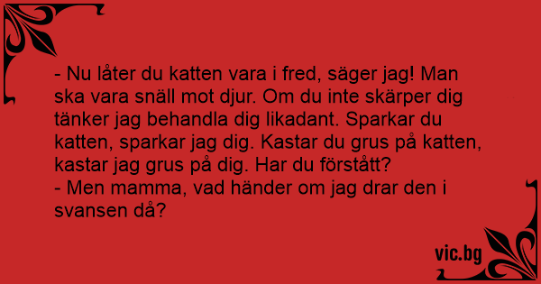 - Nu låter du katten vara i fred, säger jag! Man ska vara snäll mot djur. Om du inte skärper dig tänker jag behandla dig likadant. Sparkar du katten, sparkar jag dig. Kastar du grus på katten, kastar jag grus på dig. Har du förstått?