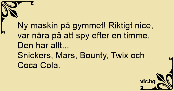 Ходих на фитнес и видях нова машина. Във фитнеса има нова машина. Ползвах я около час и вече ми е много зле. Иначе има всичко, марсове, сникърси, меденки, кола ... Just been to the gym and there's a new machine. Only used it for an hour as I started to feel sick. Its good though, it does everything 'Kitkats, Mars bars, Snickers and crisps'! We hebben een nieuwe machine op de sportschool, ik heb deze zeker een uur lang gebruikt totdat ik me ziek begon te voelen. Het is echter een top machine en heeft werkelijk alles. Mars, Twix, Kit...