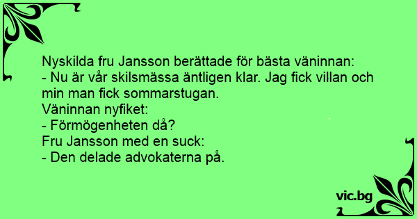 - Nu är vår skilsmässa äntligen klar. Jag fiск villan och min man fiск sommarstugan.