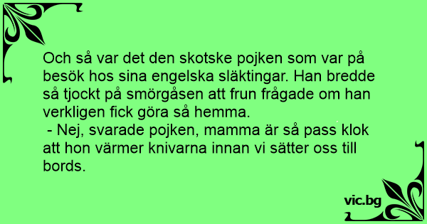 Och så var det den skotske pojken som var på besök hos sina engelska släktingar. Han bredde så tjockt på smörgåsen att frun frågade om han verkligen fiск göra så hemma.