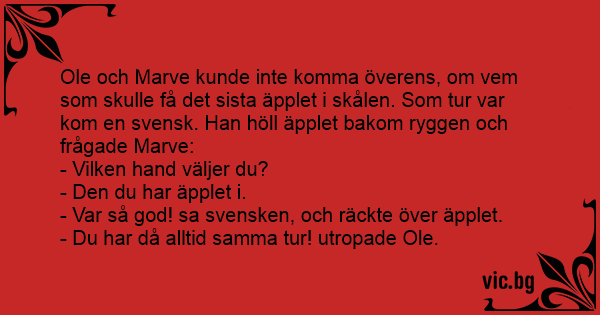 Ole och Marve kunde inte komma överens, om vem som skulle få det sista äpplet i skålen. Som tur var kom en svensk. Han höll äpplet bakom ryggen och frågade Marve: