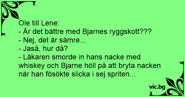 - Läkaren smorde in hans nacke med whiskey och Bjarne höll på att bryta nacken när han fösökte slicka i sej spriten...
