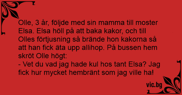 Olle, 3 år, följde med sin mamma till moster Elsa. Elsa höll på att baka kakor, och till Olles förtjusning så brände hon kakorna så att han fiск äta upp allihop. På bussen hem skröt Olle högt: