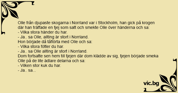 Olle från djupaste skogarna i Norrland var i Stockholm, han gick på krogen där han träffade en tjej som satt och smekte Olle över händerna och sa: