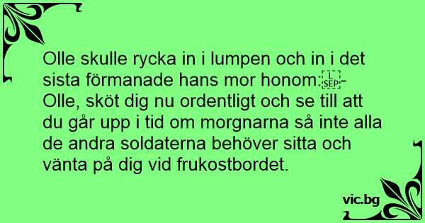 Olle skulle rycka in i lumpen och in i det sista förmanade hans mor honom: - Olle, sköt dig nu ordentligt och se till att du går upp i tid om morgnarna så inte alla de andra soldaterna behöver sitta och vänta på dig vid frukostbordet.