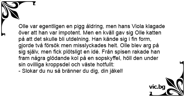 Olle var egentligen en pigg åldring, men hans Viola klagade över att han var impotent. Men en kväll gav sig Olle katten på att det skulle bli utdelning. Han kände sig i fin form, gjorde två försök men misslyckades helt. Olle blev arg på sig själv, men fiск plötsligt en idé. Från spisen rakade han fram några glödande kol på en sopskyffel, höll den under sin ovilliga kroppsdel och väste hotfullt: