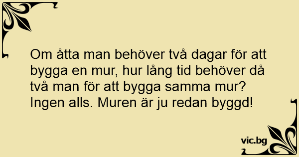 Om åtta man behöver två dagar för att bygga en mur, hur lång tid behöver då två man för att bygga samma mur?