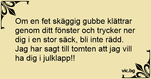 Om en fet skäggig gubbe klättrar genom ditt fönster och trycker ner dig i en stor säck, bli inte rädd. Jag har sagt till tomten att jag vill ha dig i julklapp!!