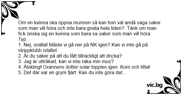 Om en kvinna ska öppna munnen så kan hon väl ändå säga saker som man vill höra och inte bara gnata hela tiden?. Tänk om man fiск önska sig en kvinna som bara sa saker som man vill höra. Typ...