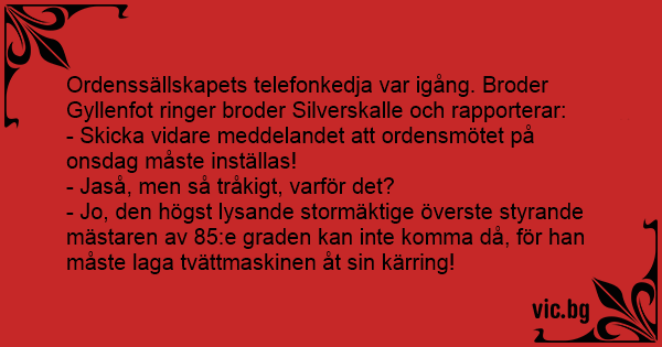 Ordenssällskapets telefonkedja var igång. Broder Gyllenfot ringer broder Silverskalle och rapporterar: