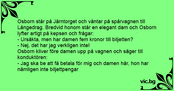 Osborn står på Järntorget och väntar på spårvagnen till Långedrag. Bredvid honom står en elegant dam och Osborn lyfter artigt på kepsen och frågar: