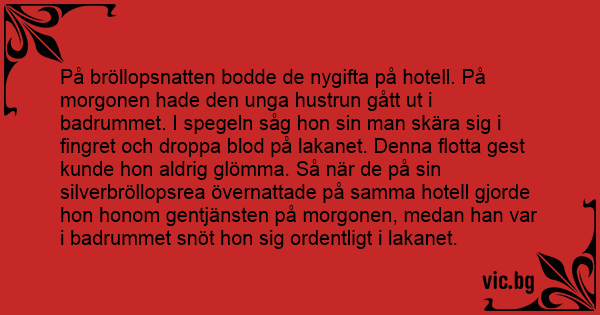 På bröllopsnatten bodde de nygifta på hotell. På morgonen hade den unga hustrun gått ut i badrummet. I spegeln såg hon sin man skära sig i fingret och droppa blod på lakanet. Denna flotta gest kunde hon aldrig glömma. Så när de på sin silverbröllopsrea övernattade på samma hotell gjorde hon honom gentjänsten på morgonen, medan han var i badrummet snöt hon sig ordentligt i lakanet.