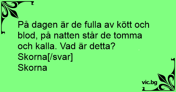 På dagen är de fulla av kött och blod, på natten står de tomma och kalla. Vad är detta? Skorna[/svar]