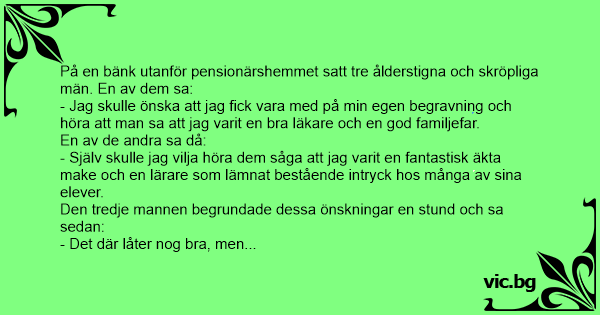På en bänk utanför pensionärshemmet satt tre ålderstigna och skröpliga män. En av dem sa: