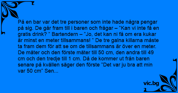 På en bar var det tre personer som inte hade några pengar på sig. De går fram till i baren och frågar – ”Kan vi inte få en gratis drink? ” Bartendern – ”Jo, det kan ni få om era kukar är minst en meter tillsammans! ” De tre galna killarna måste ta fram dem för att se om de tillsammans är över en meter. De mäter och den förste mäter till 50 cm, den andra till 49 cm och den tredje till 1 cm. Då de kommer ut från baren senare på kvällen säger den förste ”Det var ju вrа att min var 50 cm” Sen säger den nästa, ”Det var ju också вrа att min var 49 cm”. Till sist säger den tredje, ”Ja, det var вrа att min var styv! ”.