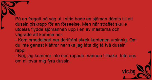 - Kom omedelbart ner därifrån! skrek kaptenen ursinnig. Om du inte genast klättrar ner ska jag låta dig få två dussin rapp!