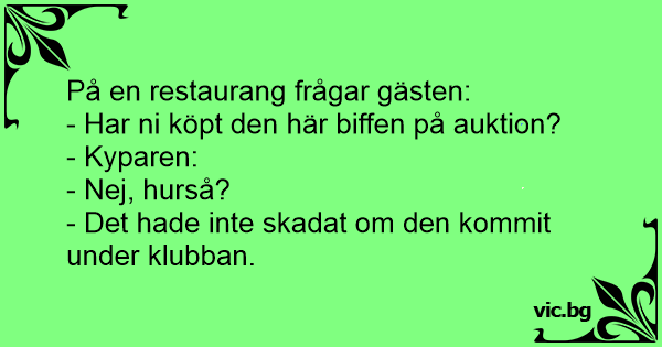 Ober: “Hoe vond u de biefstuk, mevrouw?” Mevrouw: “Per toeval, toen ik onder een blaadje sla keek.”