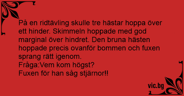 På en ridtävling skulle tre hästar hoppa över ett hinder. Skimmeln hoppade med god marginal över hindret. Den bruna hästen hoppade precis ovanför bommen och fuxen sprang rätt igenom.
