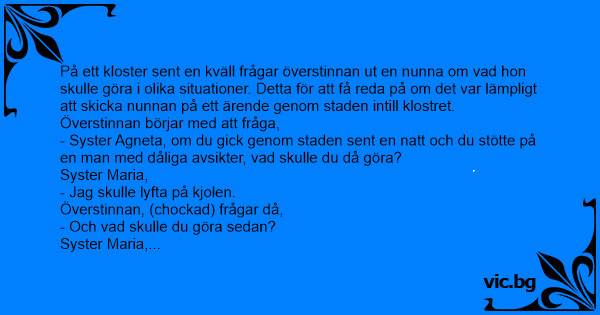 Abbedissan: - Syster Maria, om du gick genom staden sent en natt och du stötte på en man med dåliga avsikter, vad skulle du då göra? - Jag skulle lyfta på kjolen. Abbedissan chockad: ...