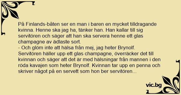 På Finlands-båten ser en man i baren en mycket tilldragande kvinna. Henne ska jag ha, tänker han. Han kallar till sig servitören och säger att han ska servera henne ett glas champagne av ädlaste sort.