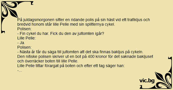En politibetjent kom ridende da han så en dreng på en cykel, han red hen til drengen og spurgte “Har du fået den cykel af julemanden?” Dreng: “ja” Politibetjent: “Så må du godt sige til ham at...