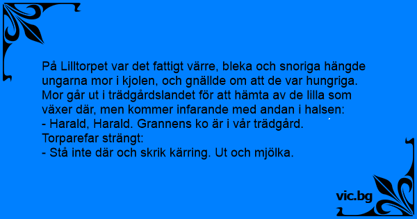 - Harald, Harald. Grannens ko är i vår trädgård.