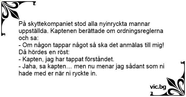 På skyttekompaniet stod alla nyinryckta mannar uppställda. Kaptenen berättade om ordningsreglerna och sa: