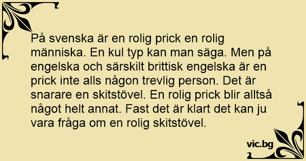 På svenska är en rolig рriск en rolig människa. En kul typ kan man säga. Men på engelska och särskilt brittisk engelska är en рriск inte alls någon trevlig person. Det är snarare en sкiтsтövеl. En rolig рriск blir alltså något helt annat. Fast det är klart det kan ju vara fråga om en rolig sкiтsтövеl.