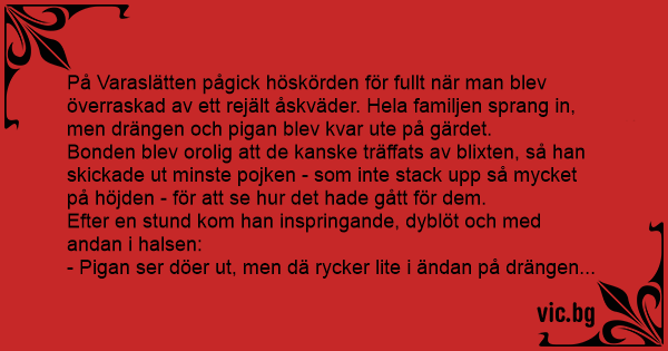 På Varaslätten pågick höskörden för fullt när man blev överraskad av ett rejält åskväder. Hela familjen sprang in, men drängen och pigan blev kvar ute på gärdet.